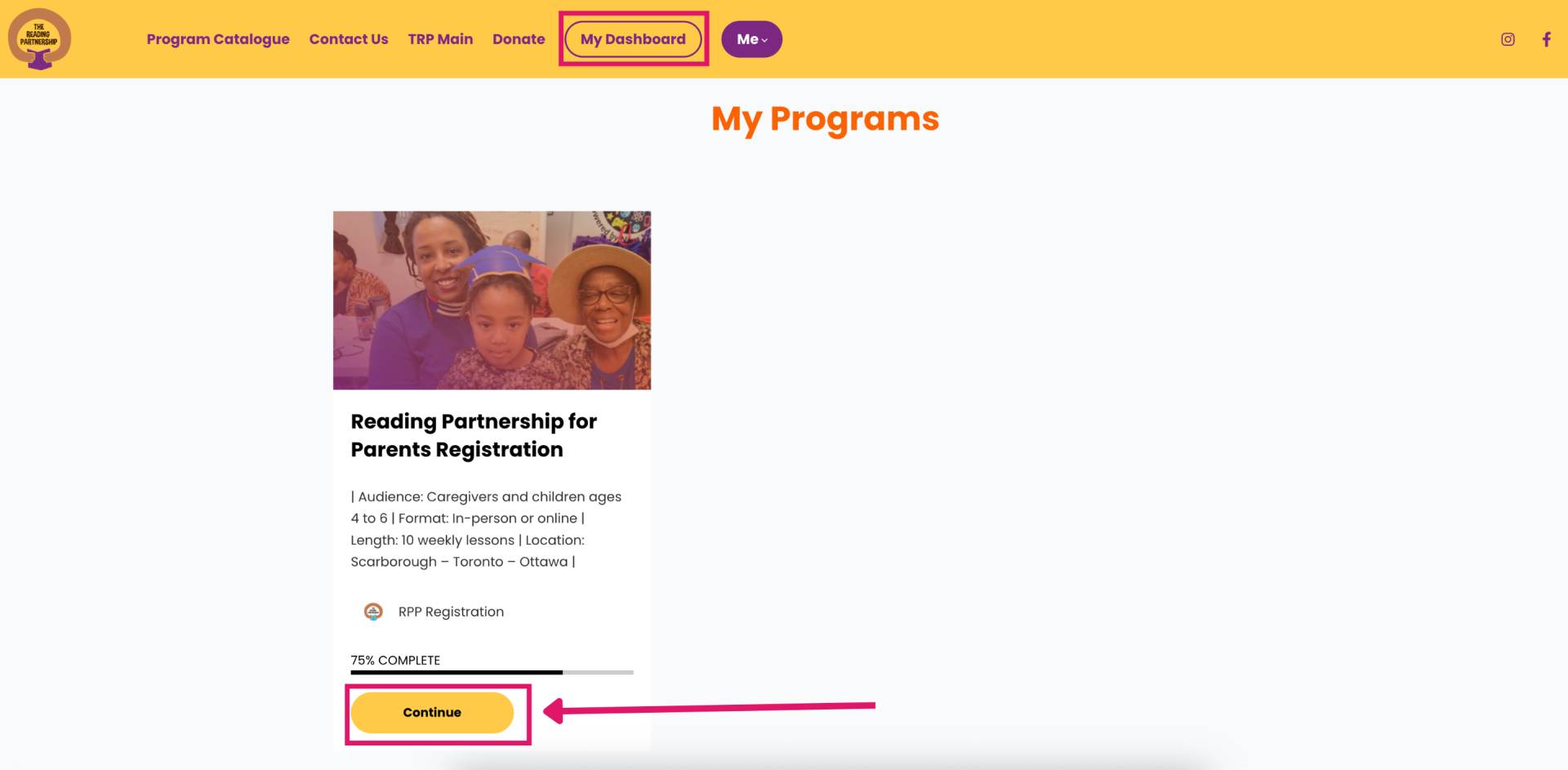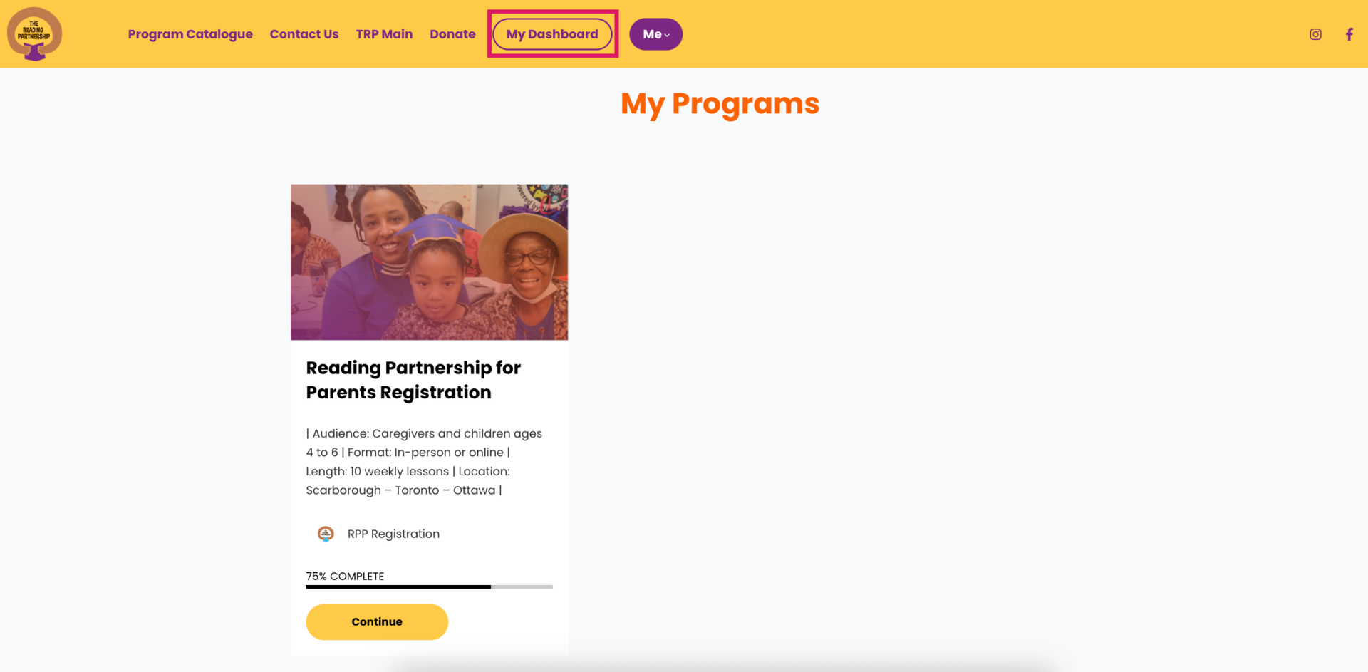 Once you click the verification link, you will be directed to your Dashboard. Under the “My Programs” section, you will find your registration. Click on “Continue” to proceed with your application.