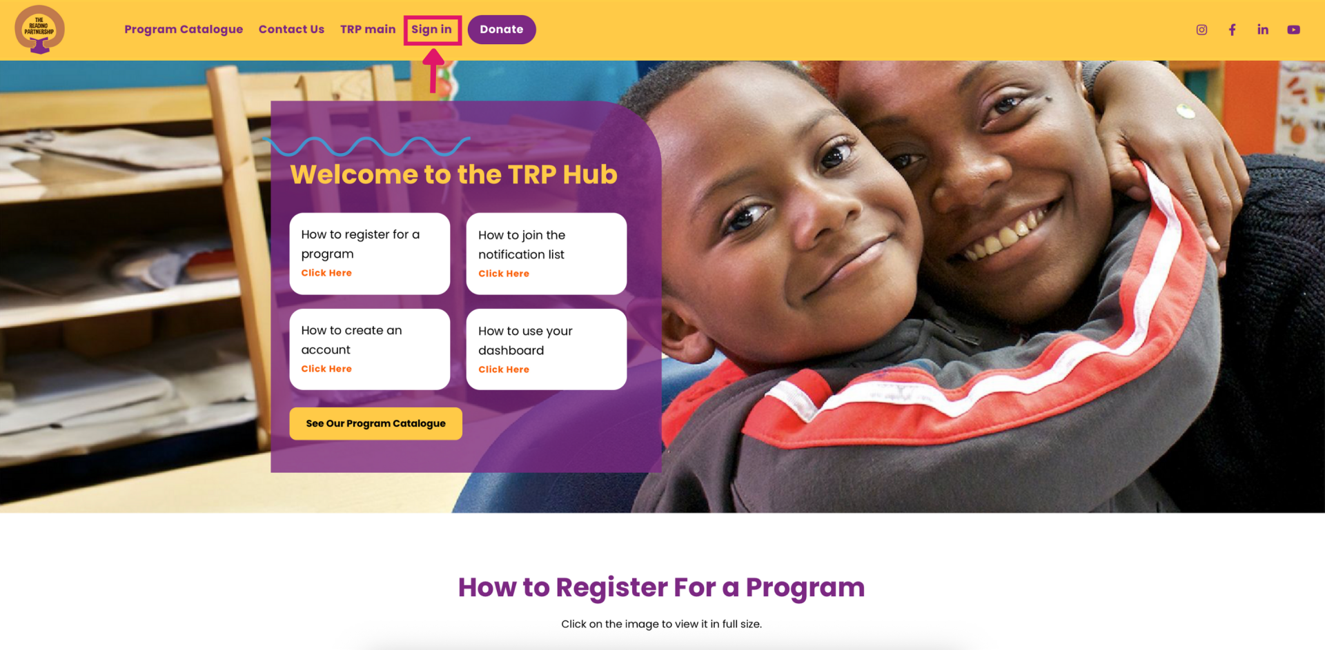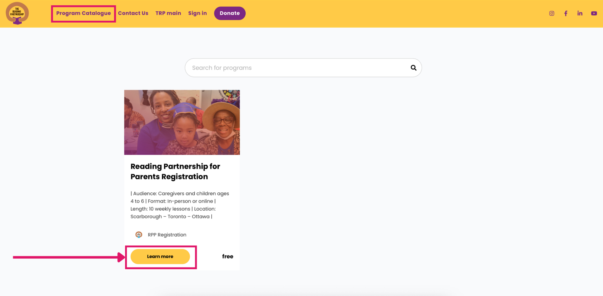 The Program Catalogue page lists all our programs. If registration is open, you’ll see a 'Learn More' button—click it to read more and start registering. If it’s closed, you can still click the program to view details and add your name to be notified when registration opens.
