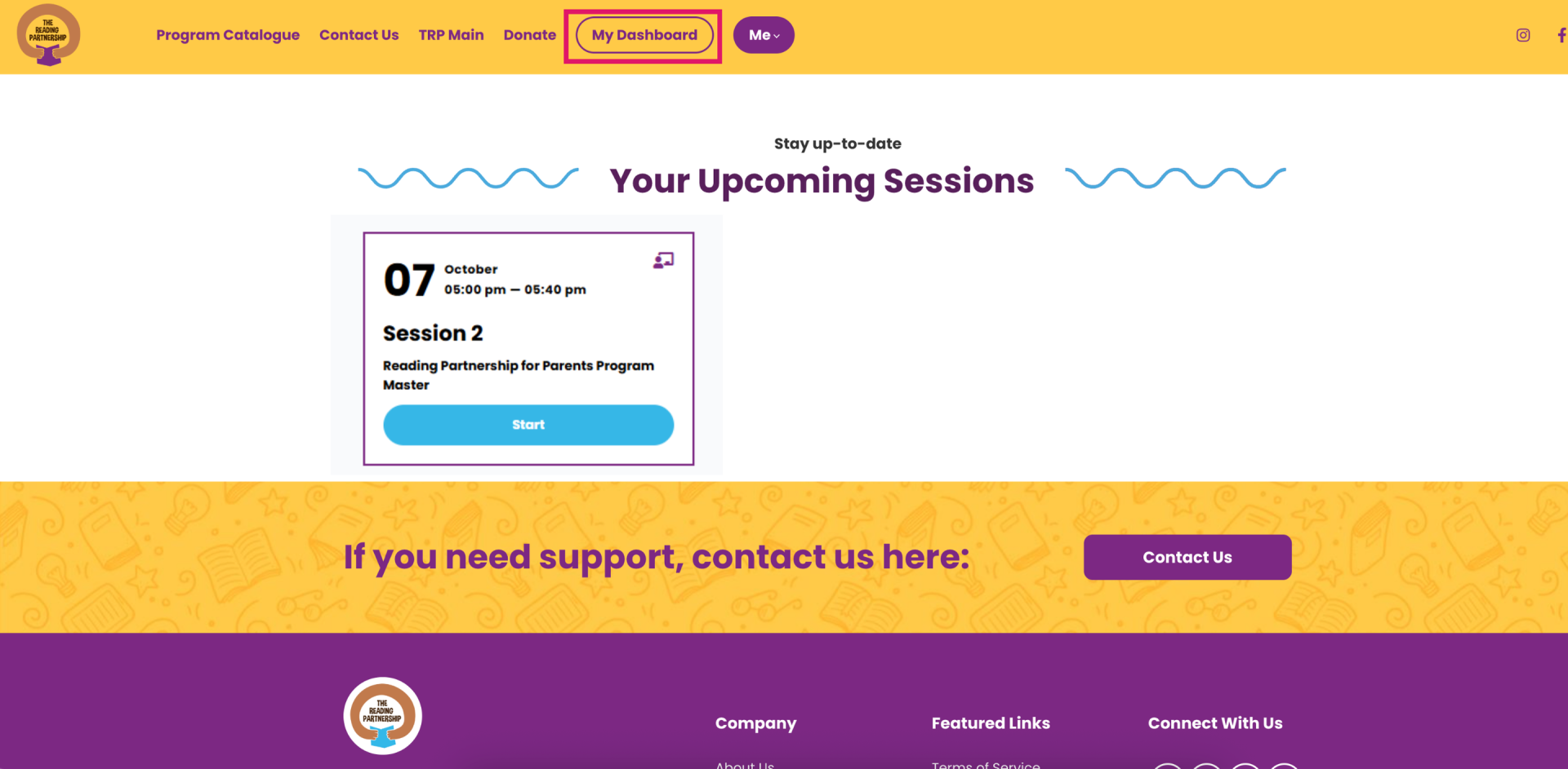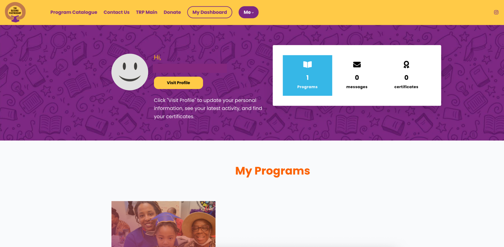 Once you've created an account and logged in, your Dashboard will show your personal information, the programs you are currently enrolled in, upcoming events, and a link to access support if needed.