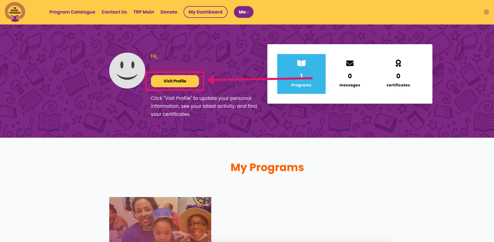 Click on “Visit Profile” to edit your personal information, add a profile image, view your latest activity, and access your certificates.