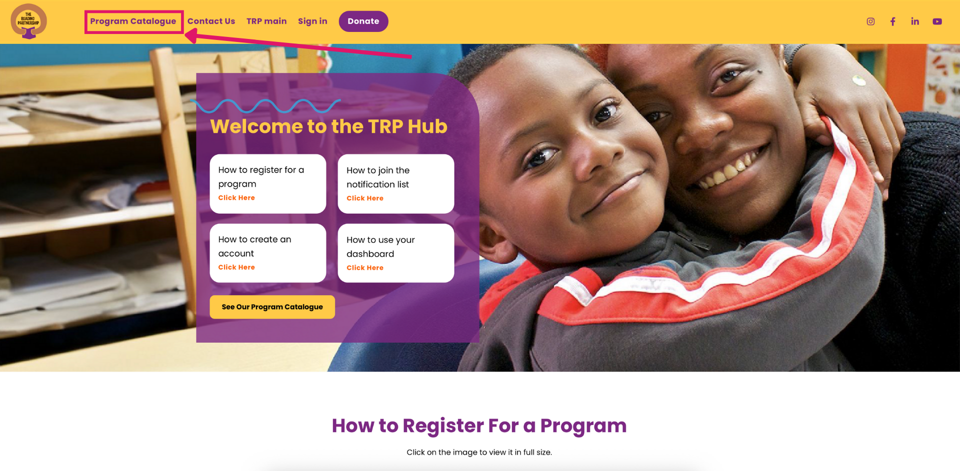 At the top of your screen, you'll see the main navigation menu—this is your gateway to exploring the hub. Click on “Program Catalogue” to view a complete list of current offerings.